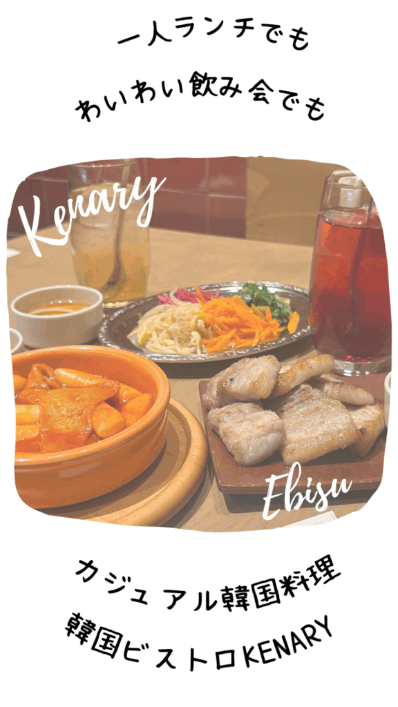 恵比寿のコスパ韓国料理ビストロKENARY(けなりぃ) KENARY in Ebisu 恵比寿にある韓国ビストロ KENARY(けなりぃ)で韓国料理😋 韓国料理といえば大皿が多いけど、 小さめポーションで提供されるので 一人でも立ち寄りやすく 色々なメニューを食べれます😊 ドリンクは、マッコリ等のアルコール他 韓国の定番美酢を使ったソフトドリンク など種類が豊富で迷うほど☺️✨ 🍽️いただいたメニュー🍽️ ●本日のキムチ4種盛り ¥750 4種は白菜キムチ、オイキムチ、 カクテキ、タコキムチ。 タコキムチが美味しかった🤩 ●本日のナムル4種盛り ¥630 季節ごとの野菜を使用した ナムルの盛り合わせで 旬のお野菜のナムルを食べれます☺️ ゴールデンポークのサムギョプサル¥750 ブランド豚ゴールデンポークの サムギョプサルはとってもジューシー✨ ● 辛口屋台のトッポギ ¥530 辛口だけど病みつきの辛さ☺️ 韓国おでんのオムクも入ってました🍢 青唐辛子と韓国のりのペペロンチーノ ¥630 青唐辛子と韓国海苔で、イタリアンと 韓国のフュージョンメニューに🤩 【韓国ビストロけなりぃ恵比寿店】 📍 恵比寿駅東口から徒歩3分 東京都渋谷区恵比寿1-20-4 Sreed EBISU 1F ⏰11:00-15:00/17:00-23:00 #恵比寿ランチ #恵比寿ディナー #恵比寿デート #韓国料理屋 【 Instagram 】 にて動画で投稿 しています😊 【 Youtube 】 でも紹介中! コメントを残す コメントをキャンセルメールアドレスが公開されることはありません。 ※ が付いている欄は必須項目ですコメント ※ 名前 ※ メール ※ サイト 次回のコメントで使用するためブラウザーに自分の名前、メールアドレス、サイトを保存する。 Δ